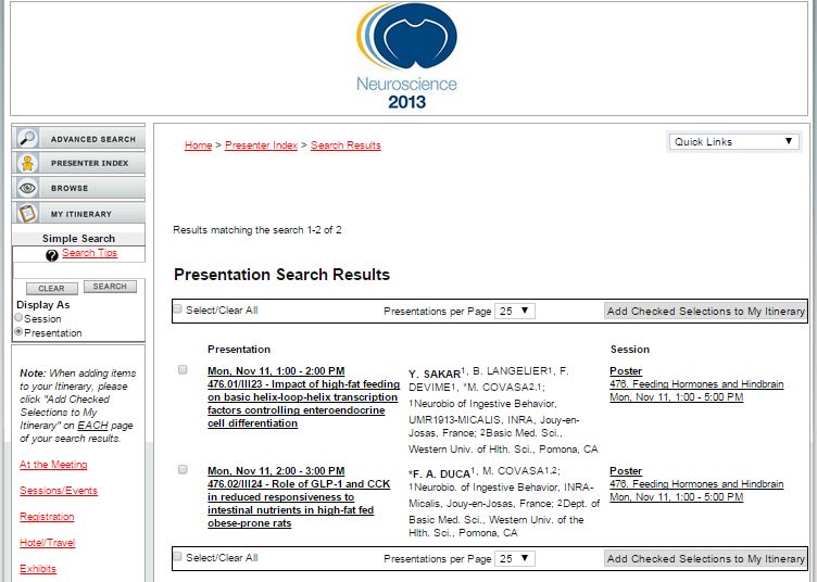 - Frank A Duca, COVASA M. - Role of GLP-1 and CCK in reduced responsiveness to intestinal nutrients in high-fat fed obese-prone rats , Society for Neuroscience, San Diego, USA, November 9-13, 2013. Neuroscience 2013 Program