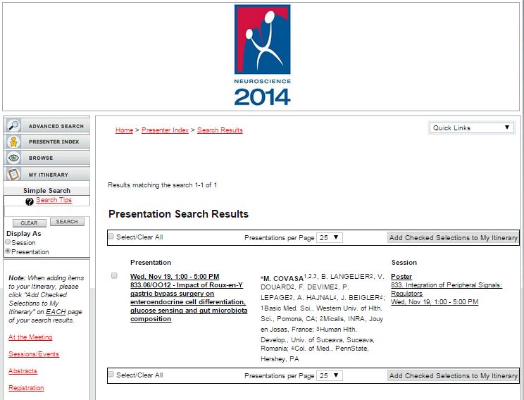 - COVASA, M., Langelier, B., Douard, V., Devime, F., Lepage, P., Hajnal, A., Biegler, J. - Impact of Roux-en-Y gastric bypass surgery on enteroendocrine cell differentiation, glucose sensing and gut microbiota composition, Program No. 833.06/OO12, Washington DC, Society for Neuroscience, 2014. Neuroscience 2014 Program